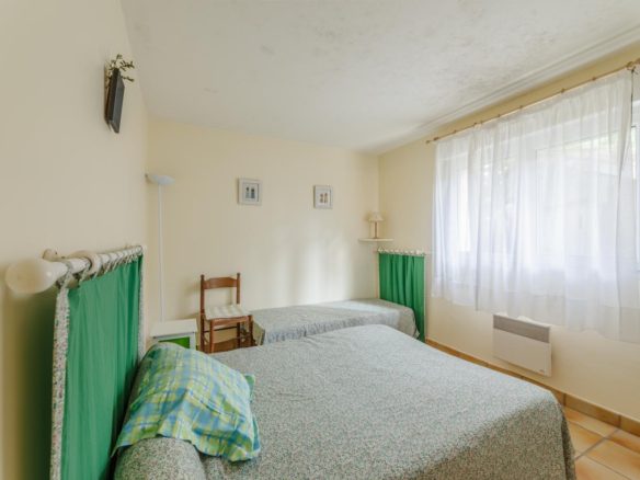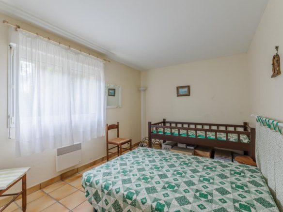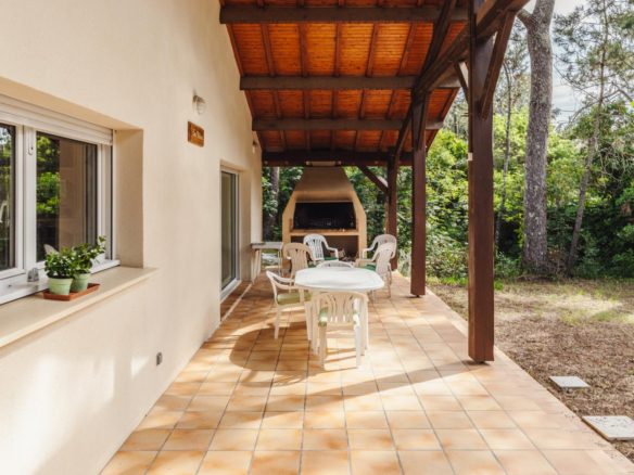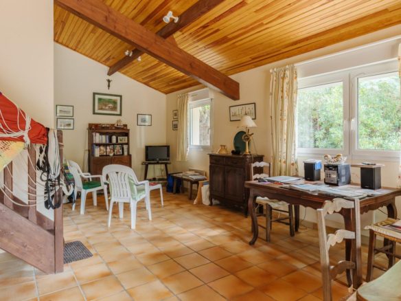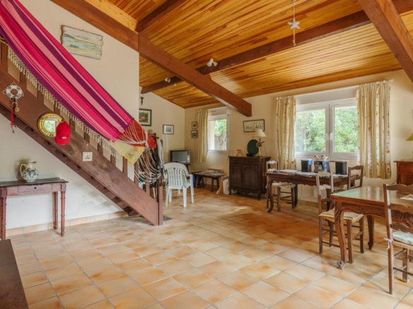 Au sein d’une parcelle de pinède, la villa est ouverte sur une terrasse protégée d’une avancée. La grande pièce de vie accueille une cheminée. La cuisine semi ouverte est entièrement aménagée et équipée. Elle offre une idéale fonctionnalité.
