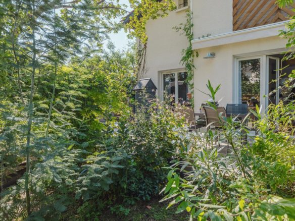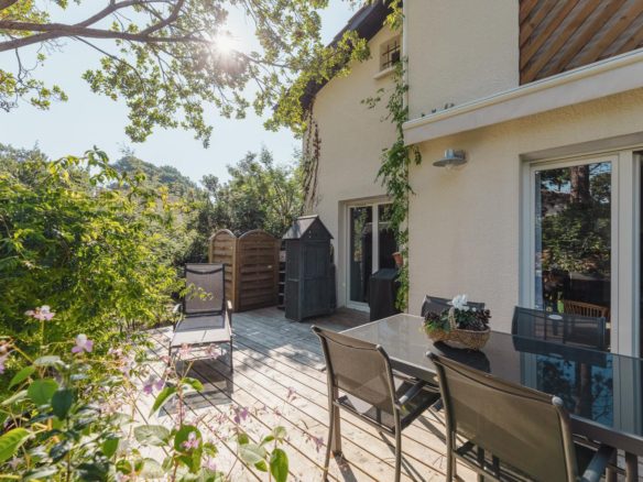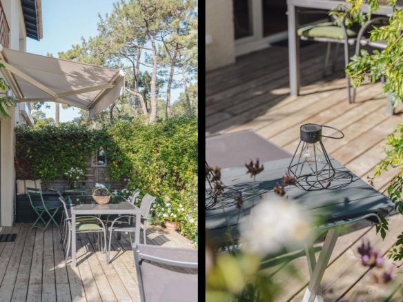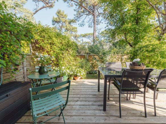 La terrasse extérieure est suffisamment vaste, nichée au cœur d’un écrin végétal.