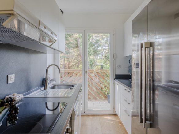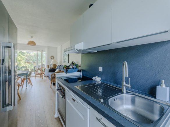 Une distribution intelligente des volumes permet une habitabilité optimale. L’espace de vie est clair et spacieux, ouvert sur la végétation extérieure et la terrasse. La cuisine est bien aménagée et équipée, lumineuse et parfaitement fonctionnelle.