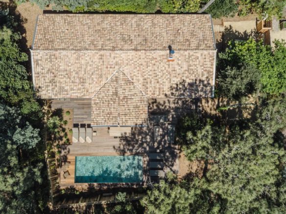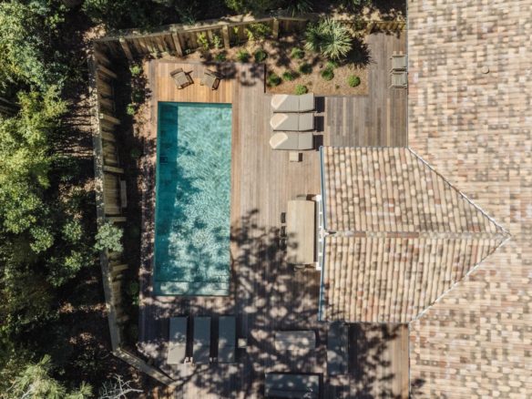 Le jardin paysagé multiplie les essences locales, autour d’une magnifique piscine carrelée.