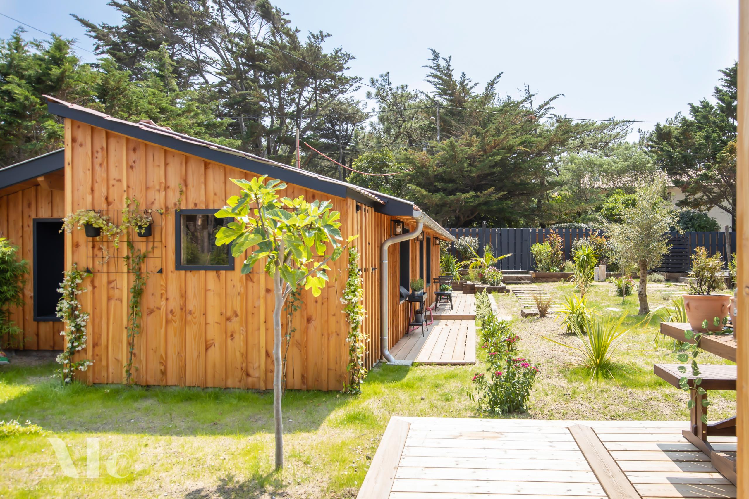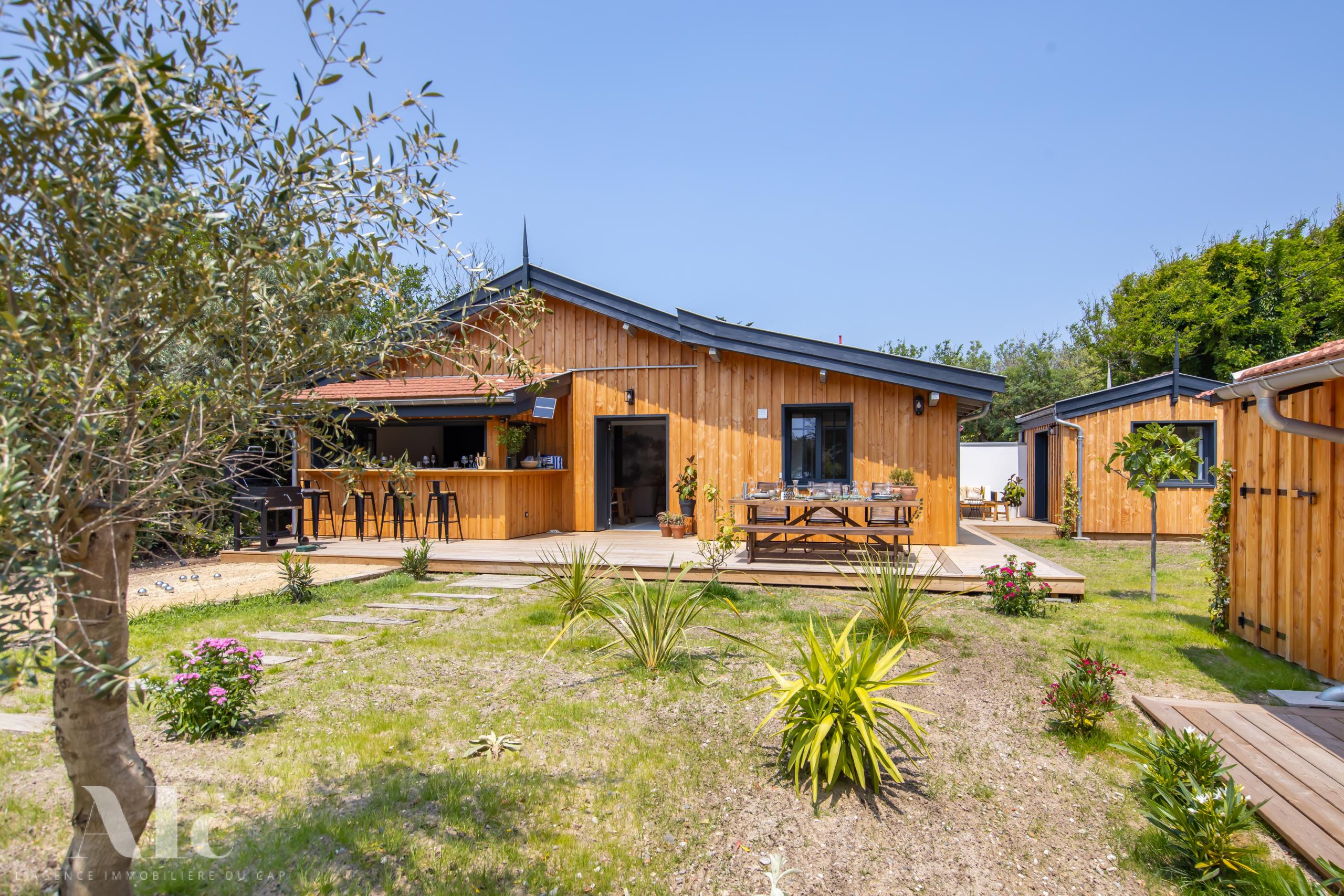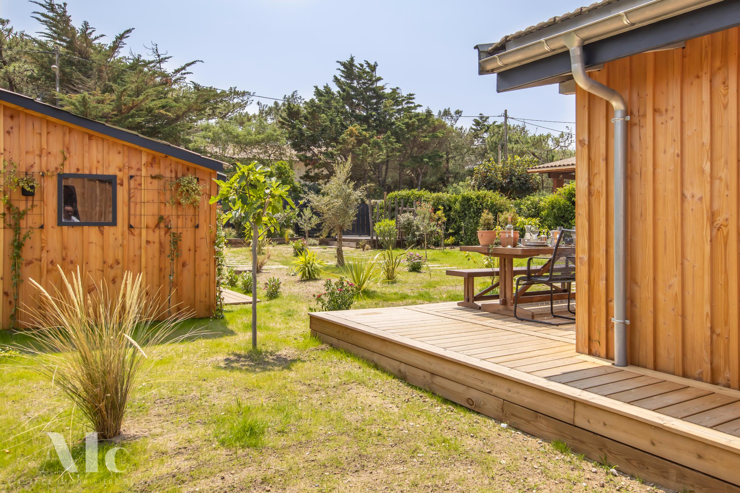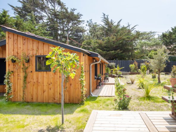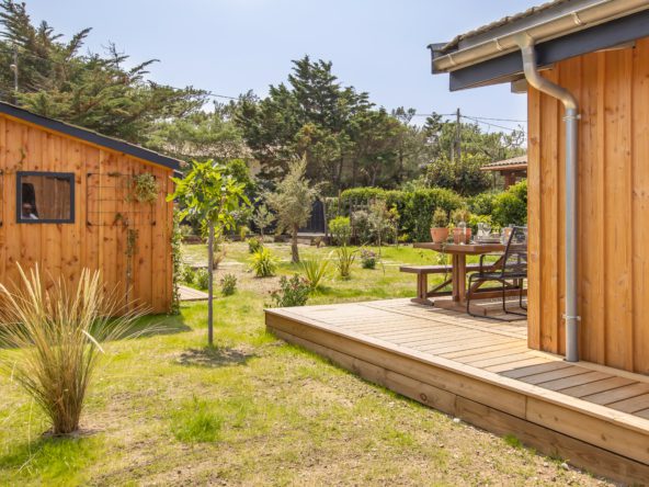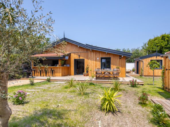 Articulées autour d’un jardin clos avec terrasse bois, une villa principale avec cuisine ouverte sur l’extérieur, et deux dépendances dont un cabanon d’invité avec salon.
