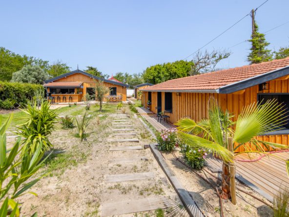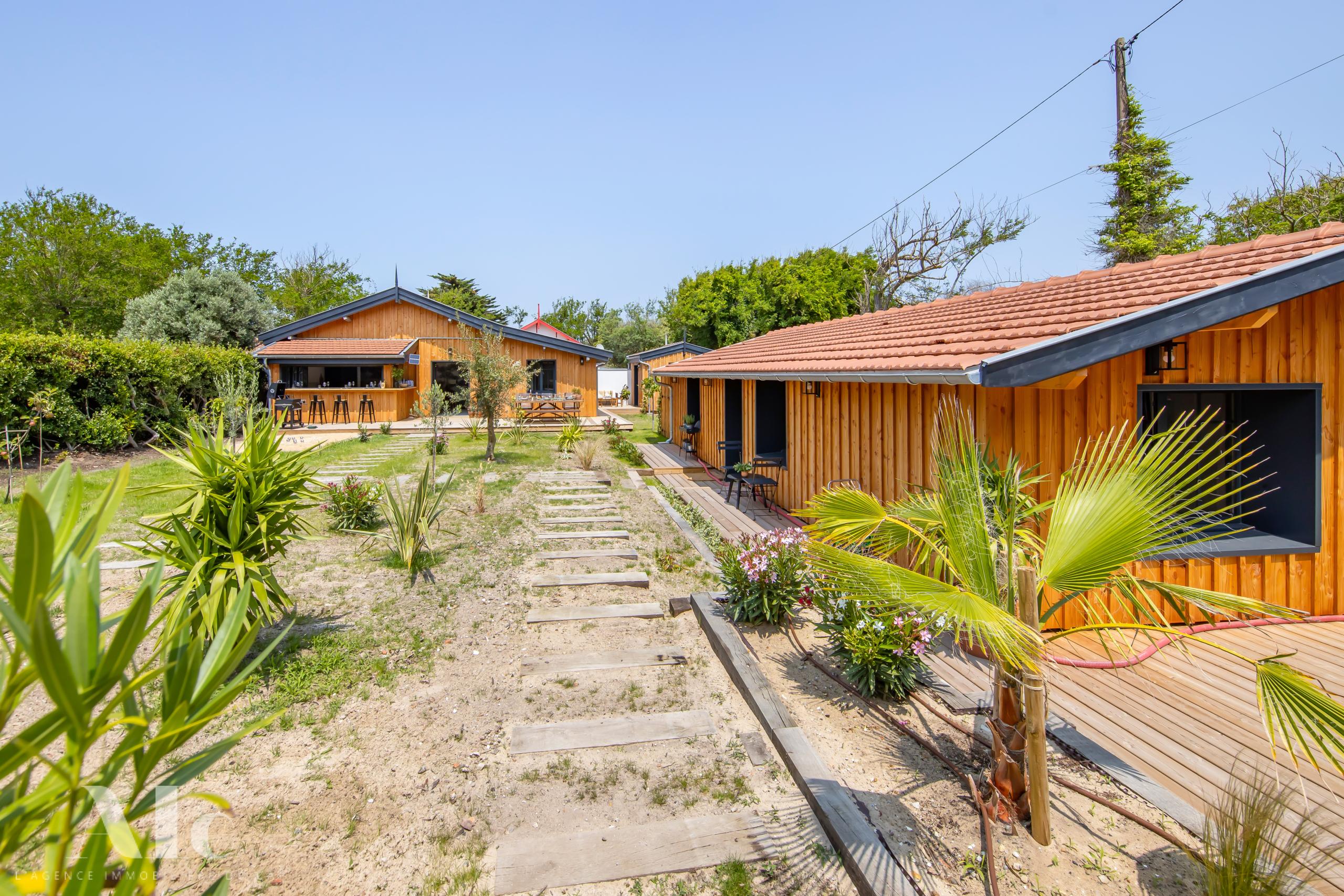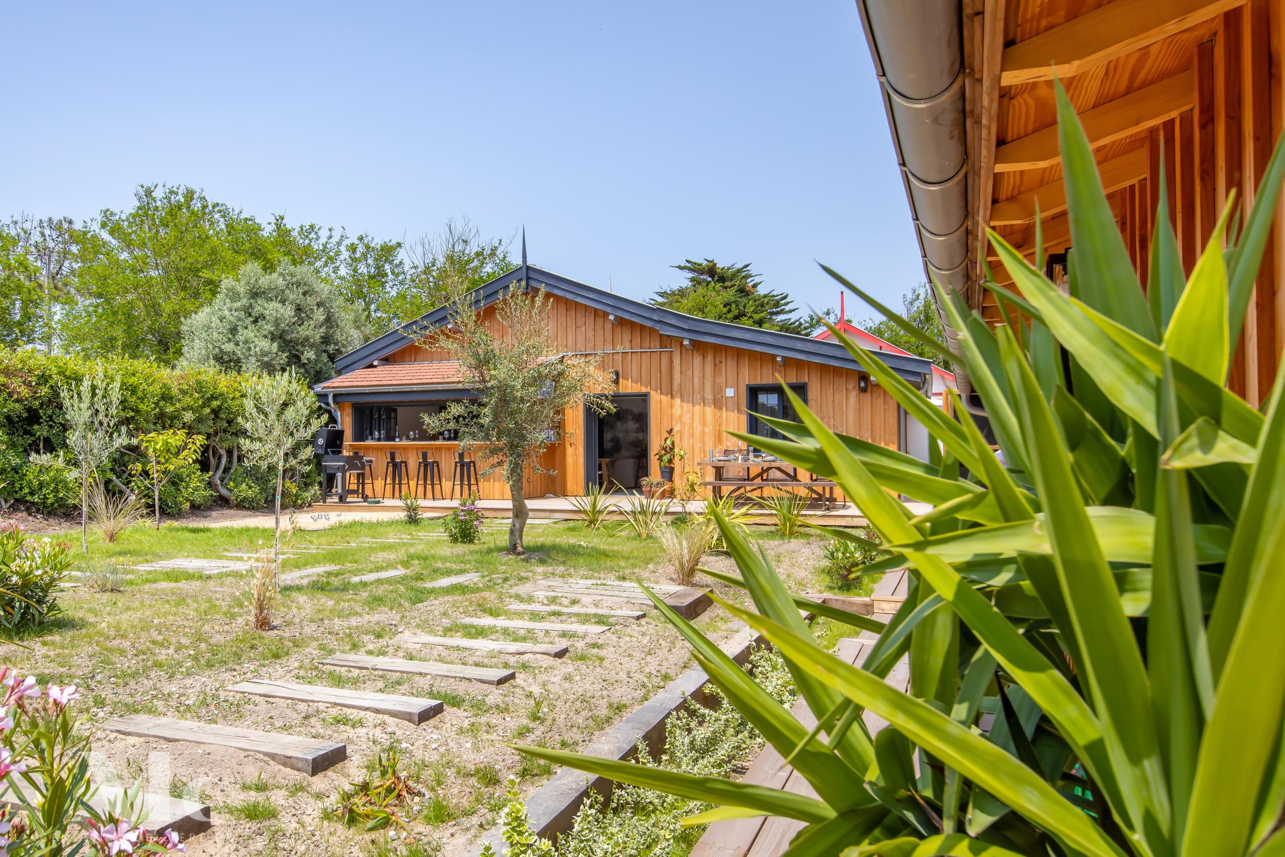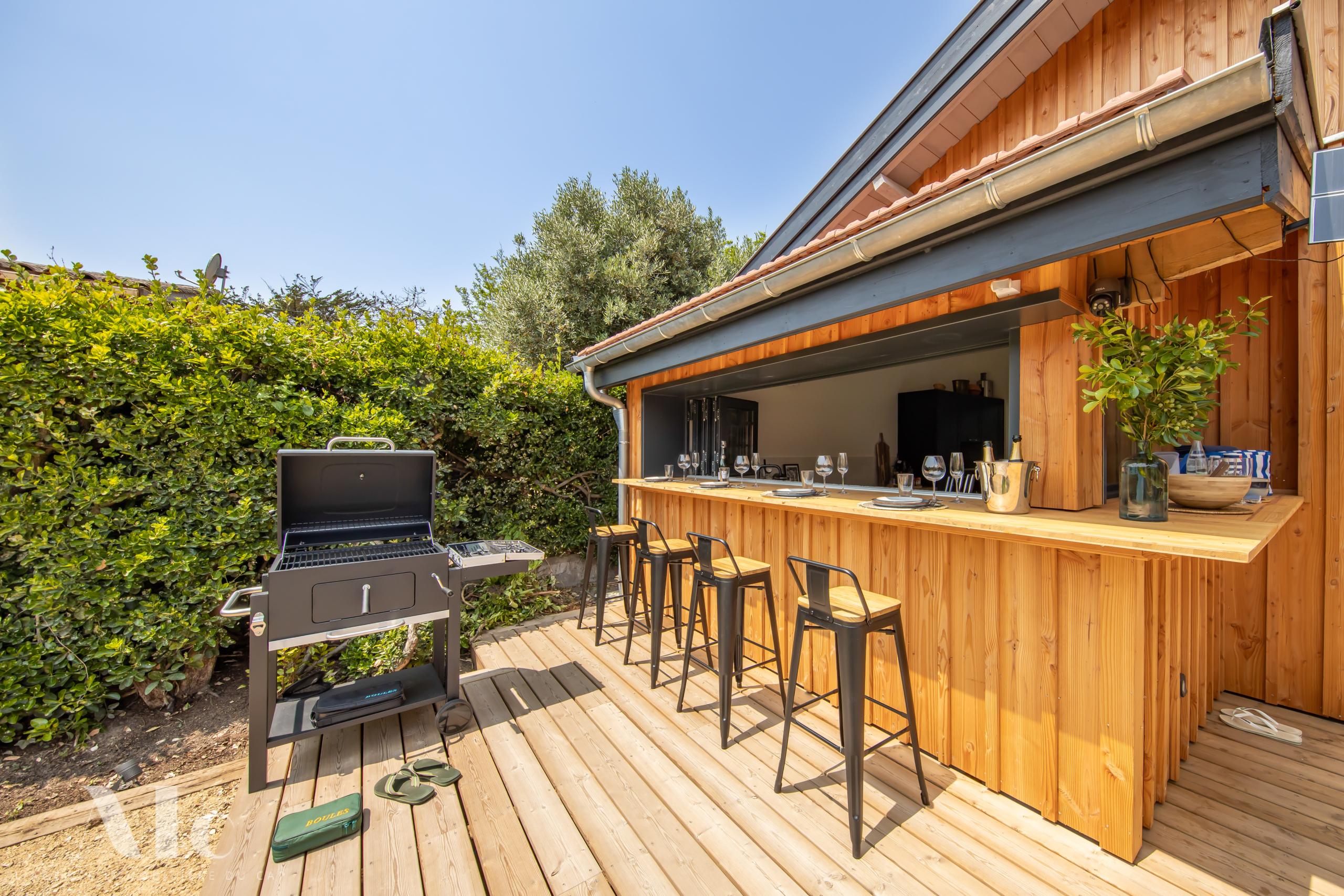 Articulées autour d’un jardin clos avec terrasse bois, une villa principale avec cuisine ouverte sur l’extérieur, et deux dépendances dont un cabanon d’invité avec salon.