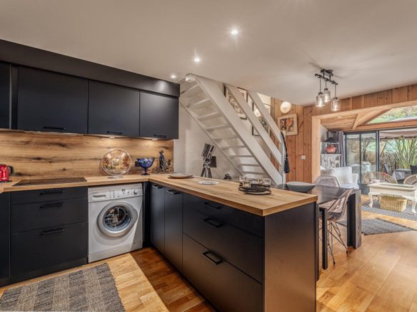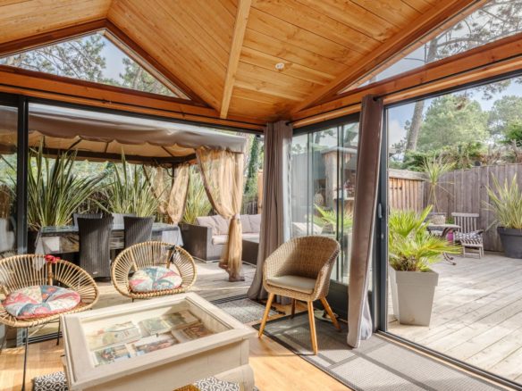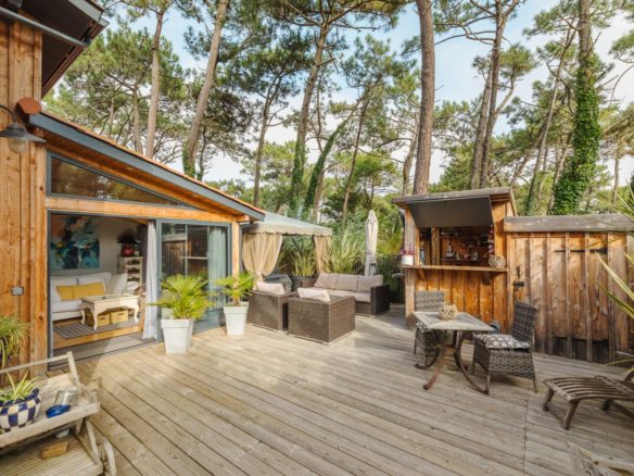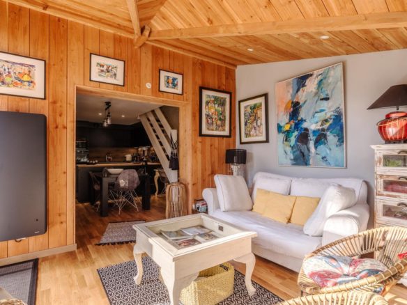 Un parfait agencement des espaces, ouverts sur la végétation et une vaste terrasse bois pour profiter des extérieurs sans contrainte. Les pièces sont lumineuses, l’originale architecture bois est extrêmement cosy et harmonieuse.
