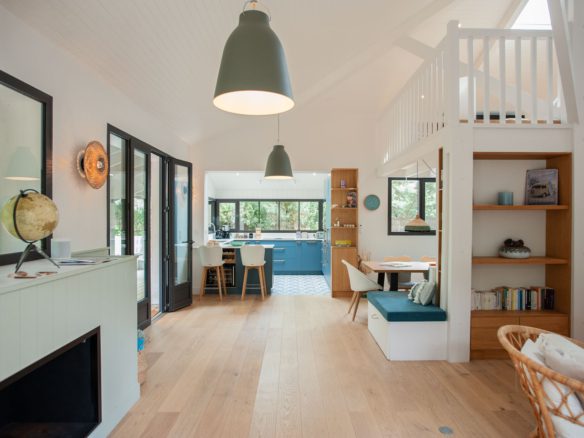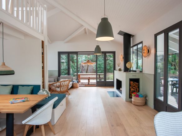 A la pointe du Cap Ferret dans un quartier résidentiel proche de tout, celle jolie villa tout bois fait la part belle au confort et aux volumes.