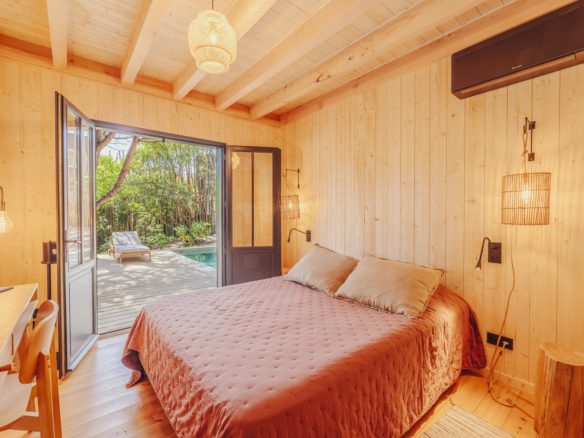 - Chambre avec lit en 160 cm, rangements, accès extérieur