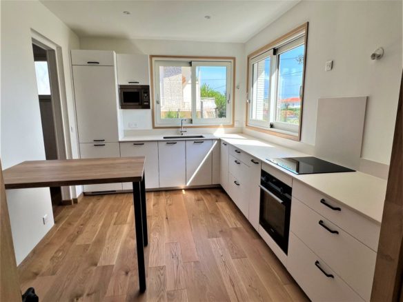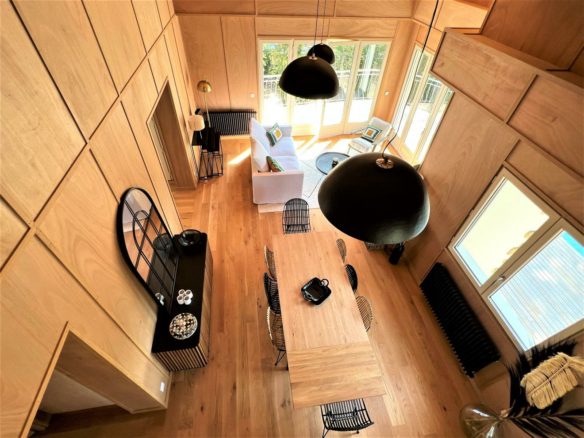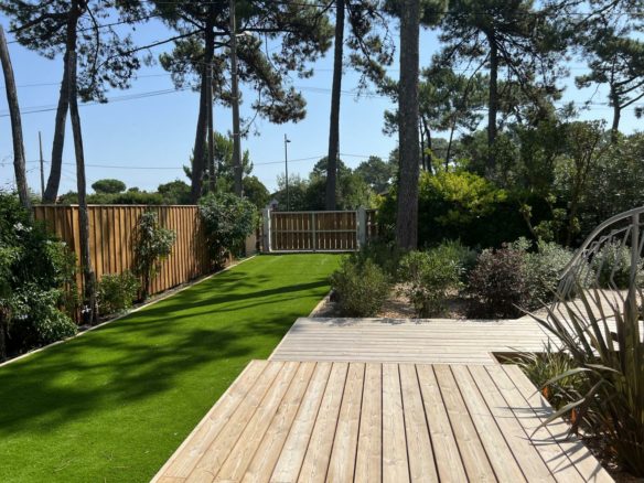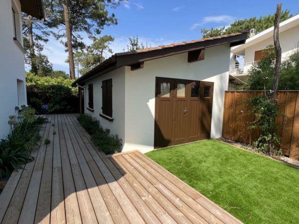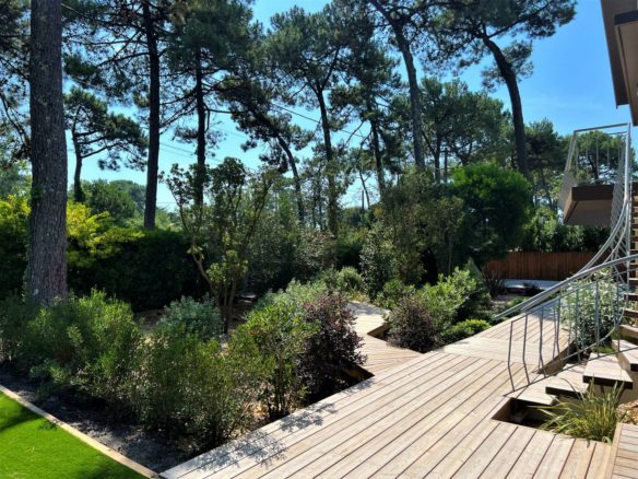 Sa confortable parcelle est arborée et bien aménagée pour offrir un maximum d’agrément. Terrasse, coursives bois cheminant au cœur du jardin, la maison est ainsi entourée et bien préservée par la végétation.