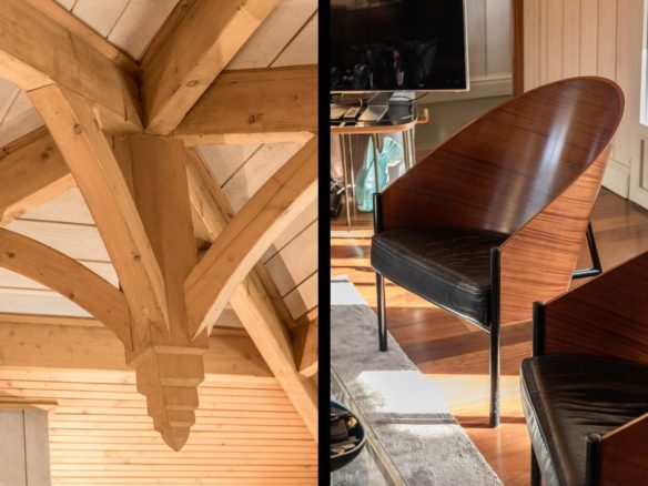 A spectacular timber frame adorns the luminous living room. It benefits from large windows on all sides and plenty of sunshine at all times of day. A beautiful wood-burning fireplace warms a vast lounge and dining area.