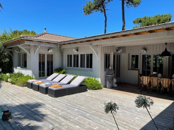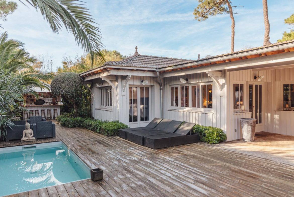 In the heart of the Mimbeau district, this elegant villa in a firsherman’s hut style in Cap Ferret is available for immediate sale