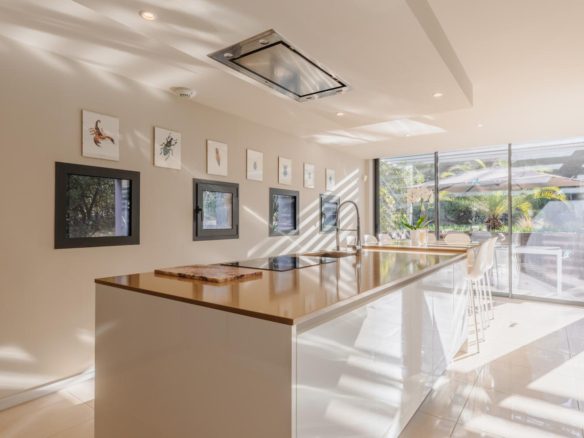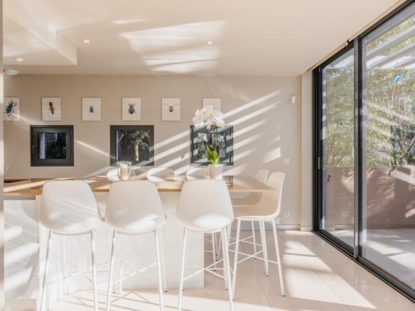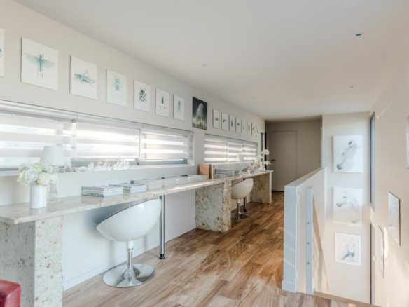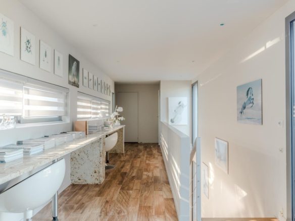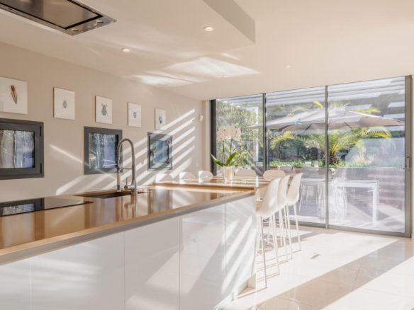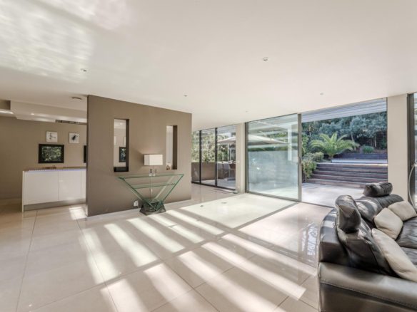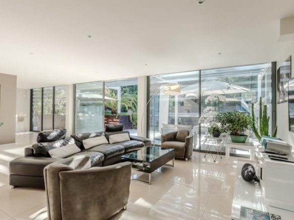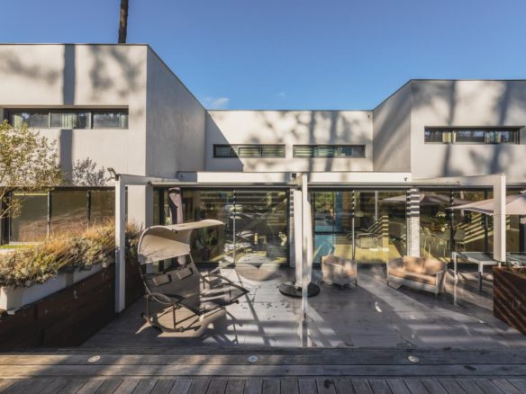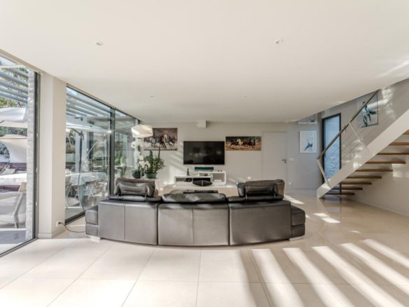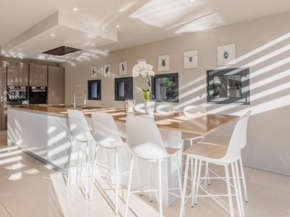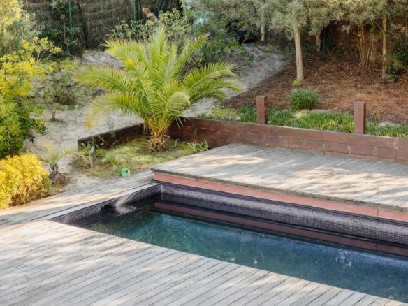 The exterior features around the villa have been meticulously designed, offering spaces that can be adapted to suit individual tastes. The mosaic swimming pool is integrated into a retractable wooden terrace.