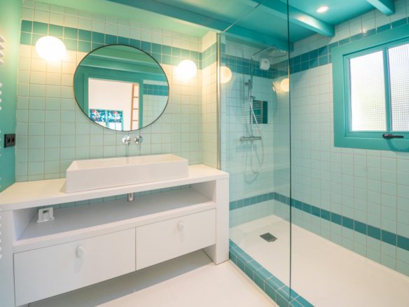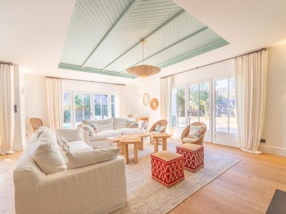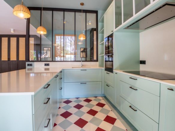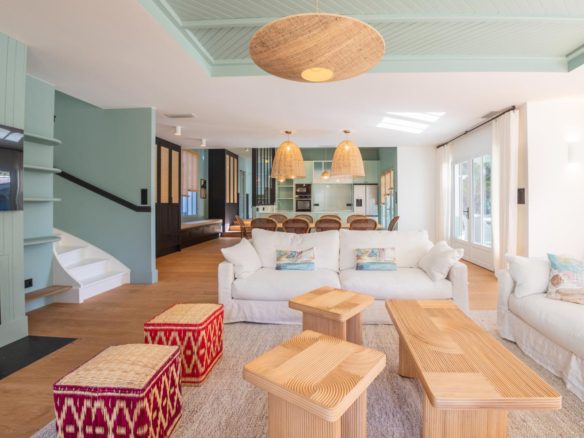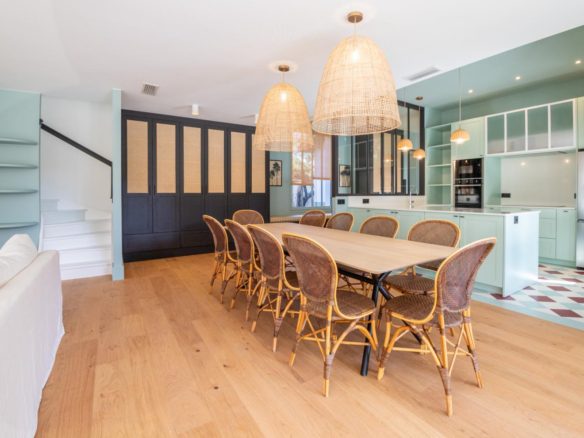 A vast reception room illuminated by studio windows opens onto the terraces and swimming pool. The open-plan, fully-equipped kitchen is particularly functional. Together, they form a warm, friendly living and entertaining space.