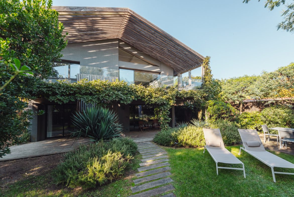 Wide protected walkways surround the house