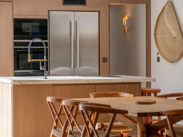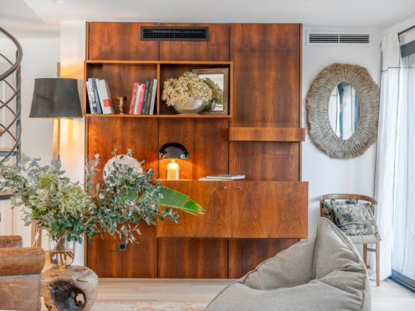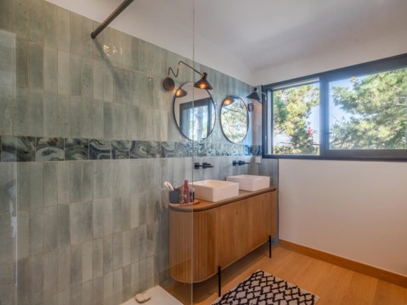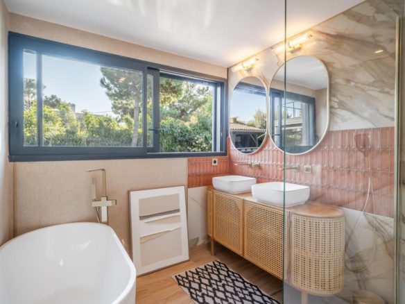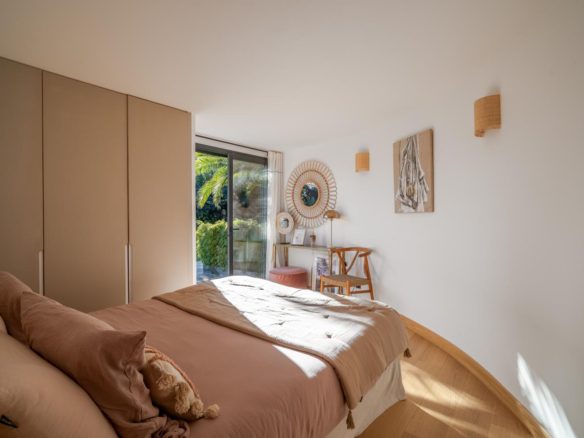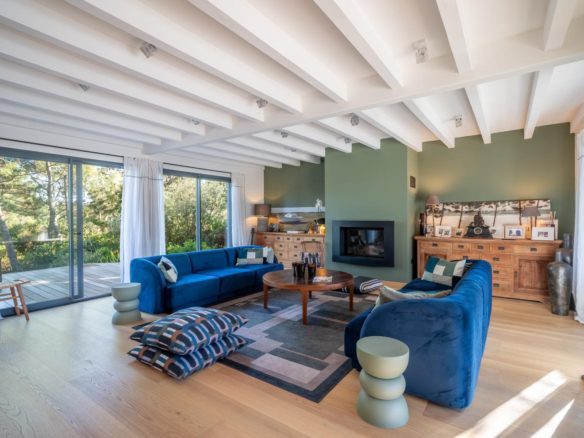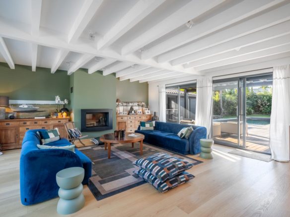The spacious living room opens onto outdoor terraces and a swimming pool. Thanks to its dual aspect, the large windows let in light and sunshine throughout the day.