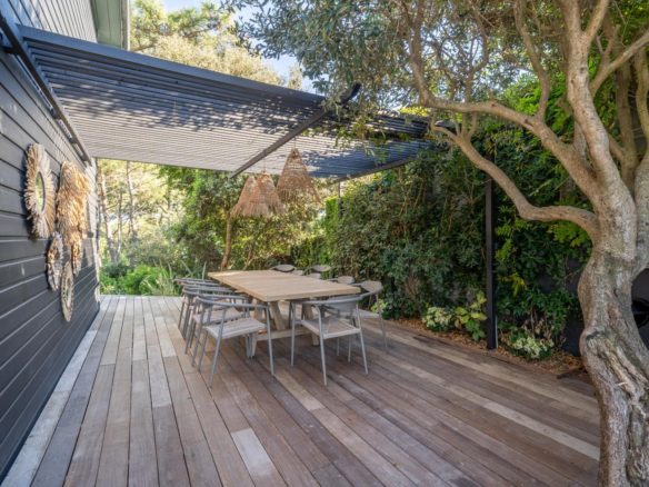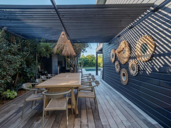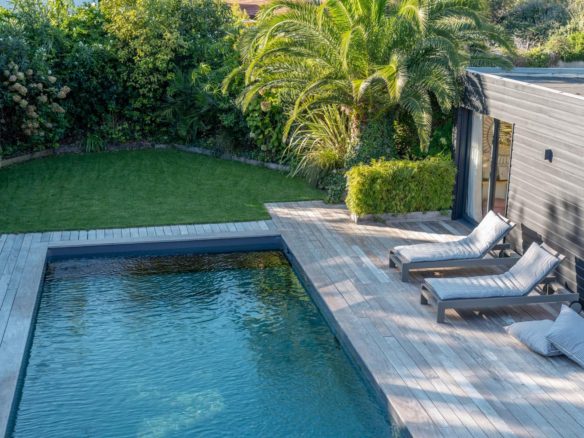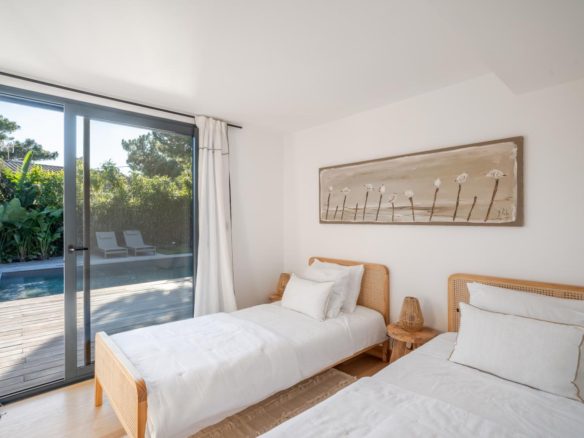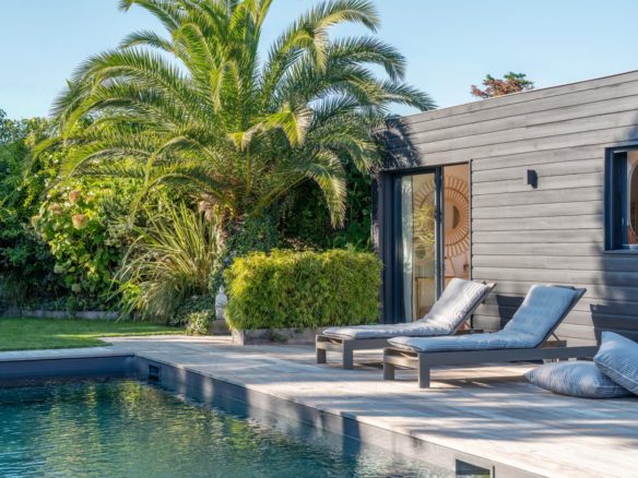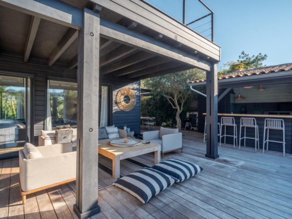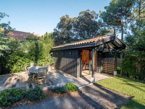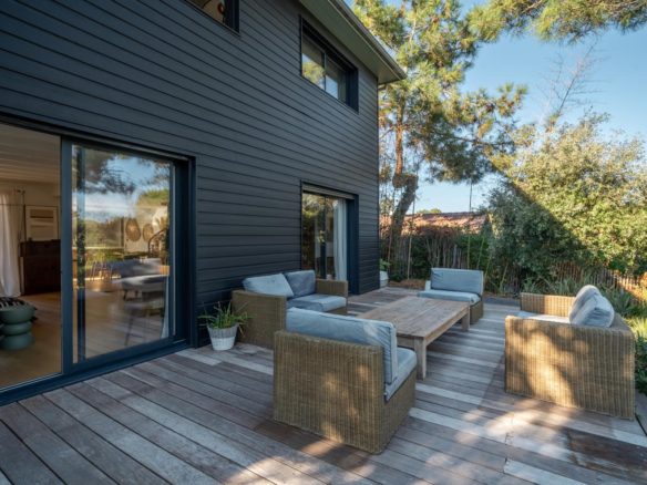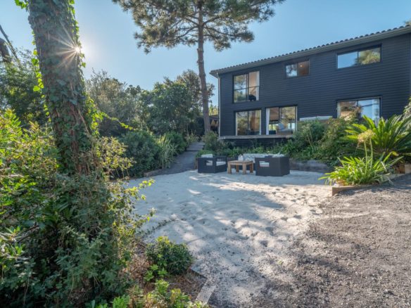This spacious wooden villa with a swimming pool is tucked away in a green setting on a beautiful enclosed plot of 1,300 m² just a stone’s throw from the village shops and beaches of Cap Ferret.