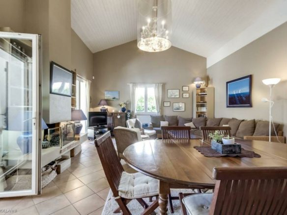 A beautiful double living room with fireplace opens out onto the terrace. The open-plan kitchen is fitted and equipped with a beautiful raised counter.